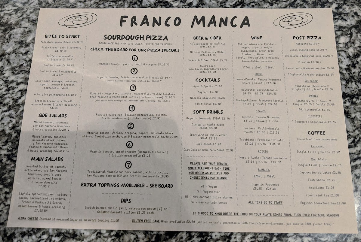 Highlights include their featured 5 a Pizza deal, enticing food lovers with both variety and value. The atmosphere is inviting, with staff like Ti and Cara providing attentive, friendly service that enhances the overall dining experience. Whether you're indulging in their delicious tiramisu or pairing your meal with optional dips and starters, every visit promises delightful moments. Franco Manca Exeter is not just a restaurant; it’s a community hub where each bite feels like a return home.